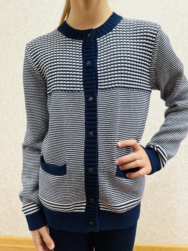 Кофточки Deloras на пуговичках, мягкие натуральные и очень теплые, плотная вязка . Идеально в школу Два цвета , черная и синяя полоска. Так же в наличии есть лосины в черном и синем цвете в размерах 120-170 Размерный ряд 120-130-140-150-160-170 Все размеры подбираются по вашим меркам