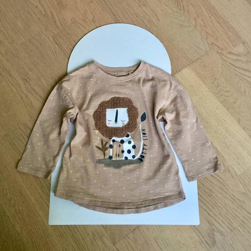 Красивый качественный реглан Next. Может быть, будет в качестве туники? С аппликацией льва, по бокам закругление, перед короче. 100% бавовна . Размер указан 2-3 года/98 см/ Замеры : плечи 37 см( рукав спущенный) /по груди 32,5 см /длина рукава 25,5 см /длина вещи по центру спины 40,5 см.