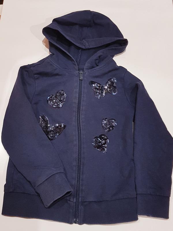 Красивая кофта OVS на замочке с бабочками из пайеток, для девочки 5-6лет. Состояние отличное. Длина 37см, рукав 39.5см, ПОГ 32см