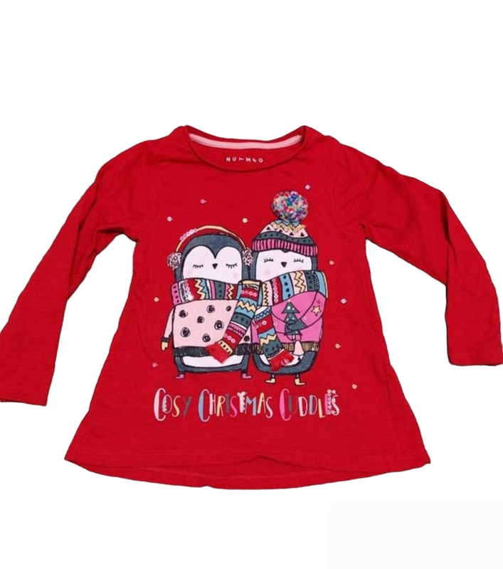 Рождественский реглан с пингвинами Легкий лонгслив с симпатичным декором 4-5 лет. Состояние красивое. Длина 44 пог28 пот30 снизу36 рукав 35 100% котон