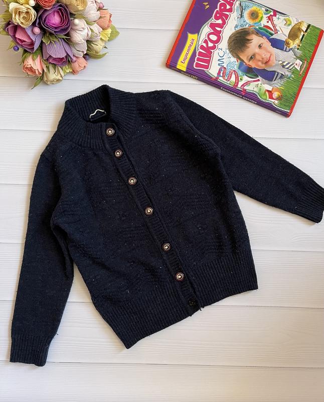 Тепла кофтина у школу. Цвет -темно-синий. По наборке 7-8 лет 122/128🤓Спереди есть милые страшилки, держатся крепко. Заменена 1 пуговица внизу,визуально не заметно в носке. Замеры: Длина- 45 см; Рукав от плеча-41 см от горловины до плеча -11 см ; Пог в застегнутом виде - 40см Производитель- Турция