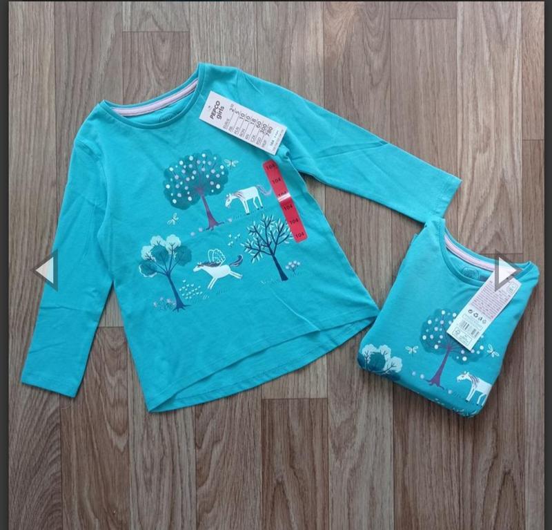 Реглан Pepco с принтом для девочки. Спинка чуточку удлинена. Цвет: бирюзово-зеленый. Размер 104 на 3-4 года, рост 98-104см. Замеры: длина спереди 39см, рукав от плеча 33.5см, ширина 30см.