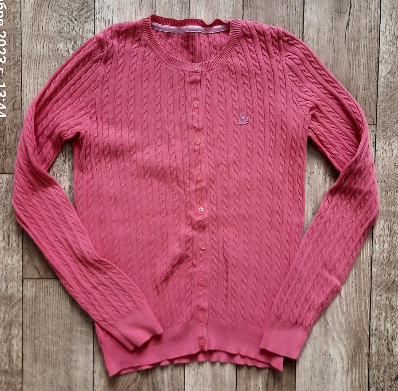 Кофта на гудзиках. В идеальном состоянии без дефектов, без пятен. Замер: длина по спине-53см, длина рукава-59см, полуобхват груди-40см, длина от плеча до плеча по спине-30см Размер: 13/14 лет