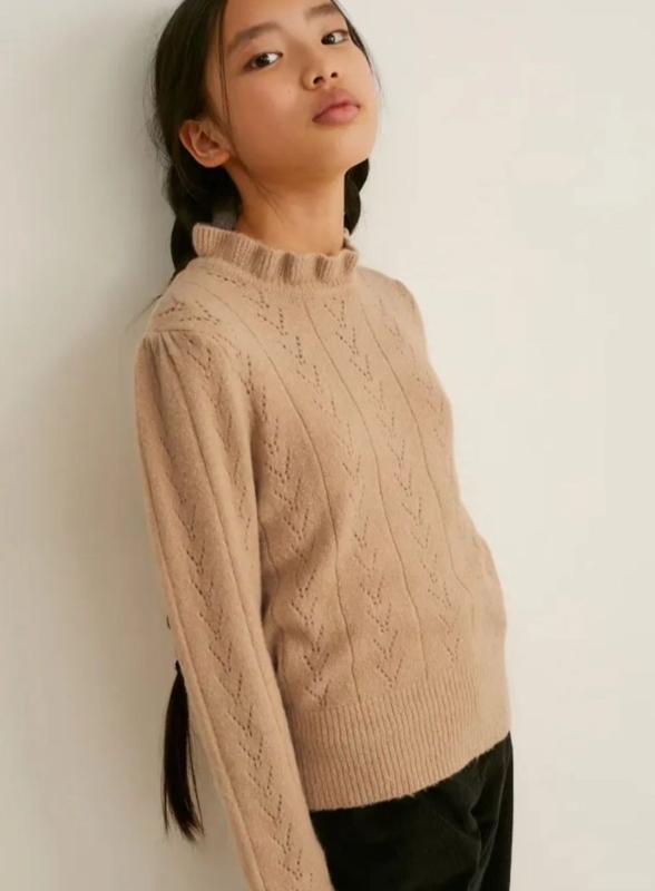 C&a ніжний светр перфорація з вишуканим рукавом та обробкою горла мягкий та приємний на дотик Є такі розміри Бежевий 128см 146см РЕЗЕРВ Малиновий 158см 146см Довжина від середини плеча 55см, півширина в районі грудей 42 в спокійному стані, еластичний, рукав від плеча с рюшею 53см