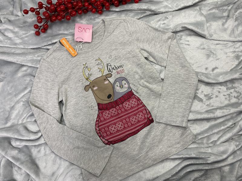 Продам класний новорічний лонгслів для дівчинки. Гарної якості. Довжина - 49см, від плеча до плеча - 30,5см, полуобхват грудей - 35см, рукав від плеча - 47см.
