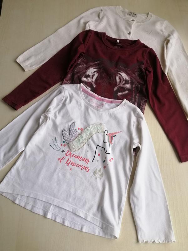Одним лотом фирменные трикотажные реглан и кофточка Next на девочку р.110-116.. В хорошем состоянии, без дефектов. Цена за все 160грн. Молочная кофточка Next длина 35,ширина 34,рукав 42. С единорожкой Primark длина 39 (сзади длиннее),ширина 33,рукав 38. С тигром Name it длина 44, ширина 30,рукав 43.