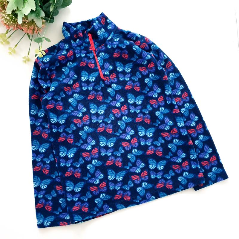 Симпатичная флисовая кофта в бабочки в отличном состоянии, по выборке 7-8 лет. Длина 50, ПОГ 35,5, рукав от плеча 44