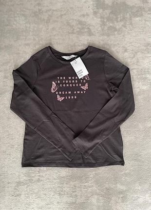 Лонгслив, тоненькая кофточка. Новая, с биркой. H&M, размер 134-140 (8-10 лет). Подойдет к росту 146. Кто уже пользовался фирмой H&M, знает что качество здесь всегда на высоте, особенно детских вещей. Ткань, не кашлатится, цвет не теряется, 100% бавовна. Красиво подойдет под все: юбки, брюки, лосины, под сарафанчики. Очень ручно, когда в футболке может быть еще прохлаще, а в кофте зажарка, такой лонгслив выручит всегда. Рукава и сама кофточка не широка, поэтому очень удобно надевать под что-то. Цвет: темно-серый, графит Замеры: рукав 51см, длина 46-47 см.