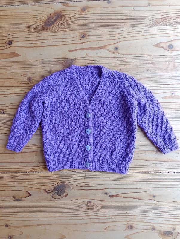 В'язана кофта для дівчинки 1,5-2 років лілового кольору.(нова)ПОГ-36 см.довжина кофти-36 см,довжина рукава:від горловини-40 см,від пахви-22 см