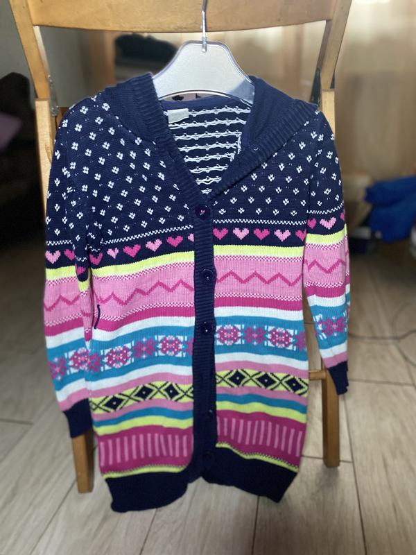 Продам прекрасну вʼязану кофту на замочку з капюшоном Состояние отлично, носили с большой любовью, но мало, быстро повысил размер. Кофта длинная, до середины бедра, что очень актуально 100 % бавовна Рост 120/126 ПОГ 34 см Длина рукава 41 см Длина по спине 60 см