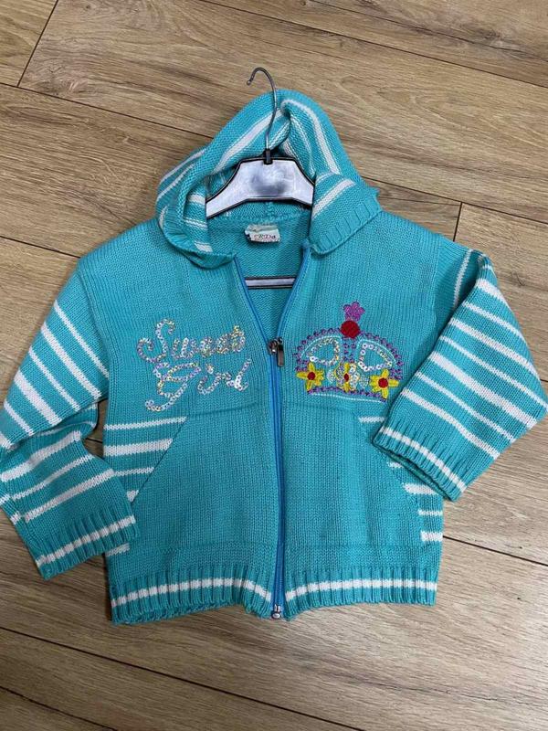 Минимальный заказ у продавца на 100 грн. Симпатичная кофточка Kids club на молнии средней плотности вязки в очень хорошем состоянии на ребенка 2-3 года. Капюшон не отстёгивается. Длина изделия по спинке 34 см, ПОГ 32 см, длина рукава от подмышки 23 см. Ткань тянется. Модель 2895
