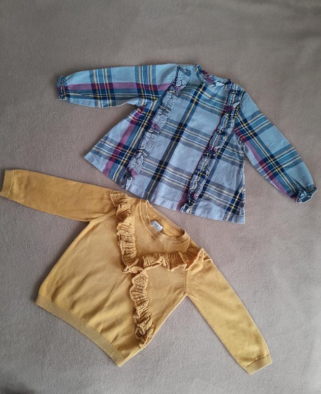 Кофточка от F&F, размер на 2-3 года, длина от плеча 33 см, рукав 32 см. Рубашка в клетку ZY, размер на 2-3 года, длина от плеча 38 см, рукав 32 см. Состояние и качество отличные.