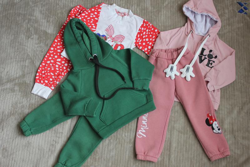 Комплект одежды для девочки 2-3 года (что-то может быть на ранее, что-то на позже - смотрите по замерам) 1. Костюм зеленый очень теплый, брюки с карманами, на ножках манжеты, пояс на резинке кофта: длина - 35см, рукав от капюшона - 34см брюки: длина - 49см, шаг - 29см, пояс - 21см (тянется) 2. Пижама - на шее, руках и ногах легкие манжетики (не давят) брюки: длина - 50см, шаг - 34см, пояс - 16см (хорошо тянется, не давит) кофта: длина - 36см, рукав от плеча - 31см 3. Кофточка с капюшоном, на молнии, с кармашками, капюшон затягивается, забавные лодочки на затяжках длина - 35см, рукав от капюшона - 36см 4. Брюки из Минни очень теплую, резинки на ножках и поясе длина - 52см, шаг - 36см, пояс - 18см (красиво тянется)