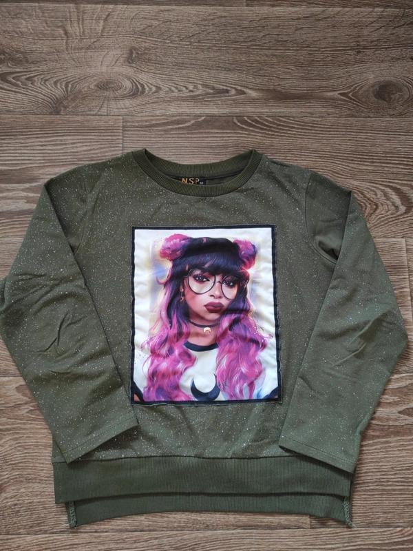 Яркая кофта для девушки. Ткань с эффектом шиммера, перед украшен аппликацией из ткани. Перед более короткий чем спинка. Длина рукава 45 см, длина 52 см ( спина), ширина 44 см
