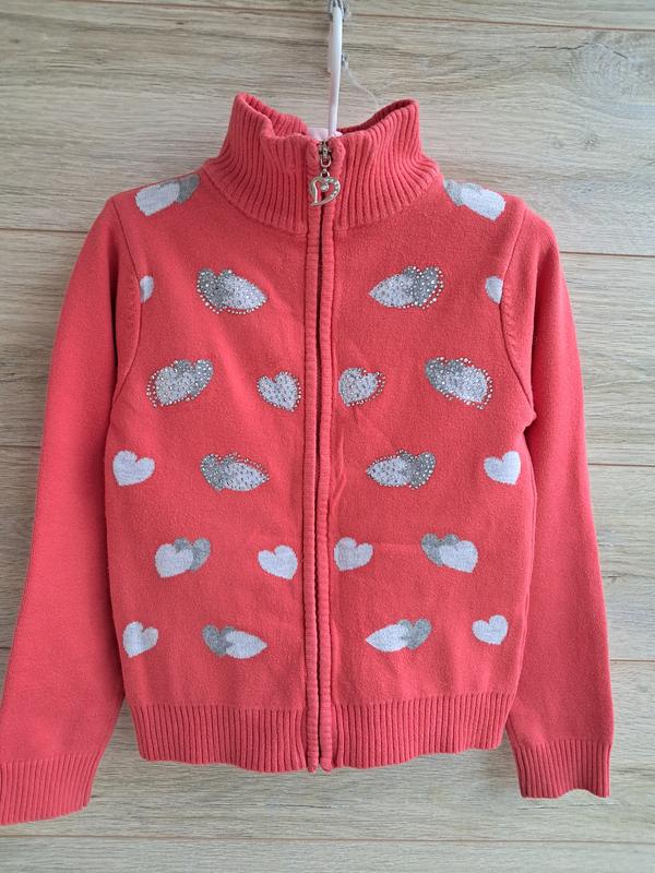 Кофта фирменная, качественная many &many, рост указан 120см, будет выглядеть раньше, в очень красивом состоянии. Цвет - коралловый. Не сток, после моей дочки, без запаха. Спереди россия из страз, все камушки на месте. Застегивается на молнию до конца, воротник-стойка, горлышко закрытое. Состав: 89,5% коттон, плотная въехала по скамейке, качественная Замеры: длина от плеча до низа -полуобхват геллы -длина рукава от плеча -.