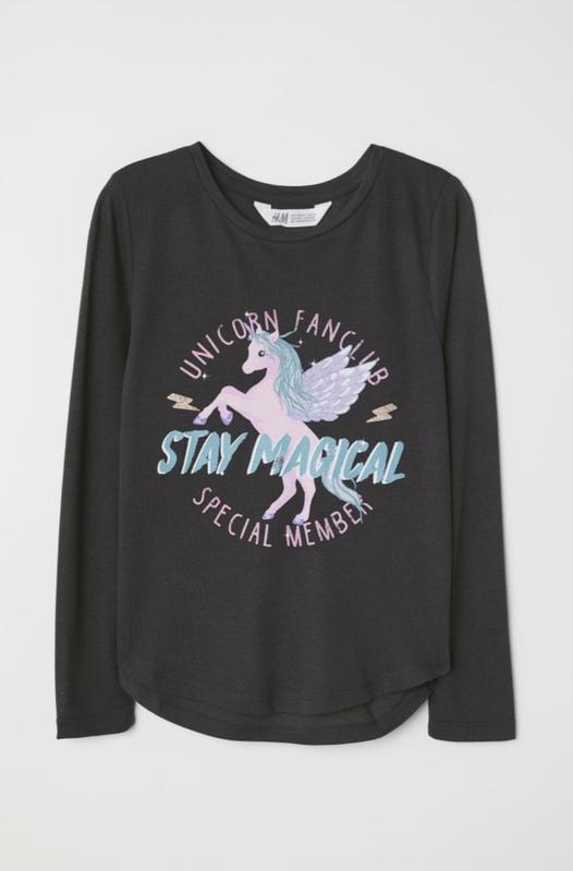 Лонгслів гарної якості з принтом єдинорога з блискітками. Склад: 52% поліестр, 48% котон. Розміри 146/152 (10-12 років), 158/164 (12-14 років), 170 (14+)