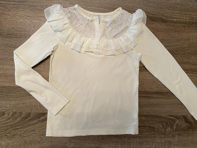 Красива кофта, носили в школу, колір молочний. Розмір вказаний 146, але сильно маломірить, підходить приблизно на 9 років. Довжина - 46 см, ширина - 34 см.