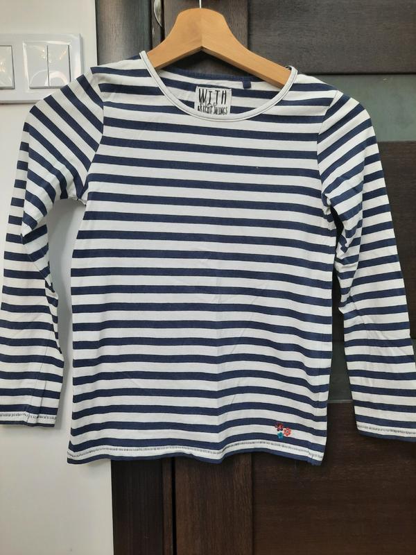 полоскатая кофточка для девочки с цветочками внизу. длина рукава около 48см, длина кофты 50 см.