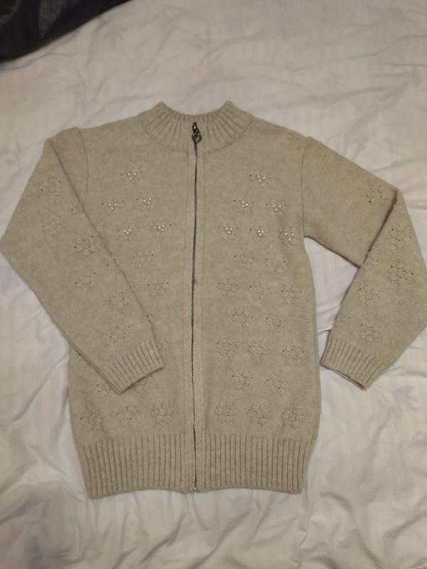 Теплая бежевая кофта из шерсти. Состояние новой. Есть маленькое пятно возле застежки, на фото 2 видно. Не пробовала выводить. На этикетке 12-13 лет. Полуобхват груди - 38 см. Тянется. Довжина - 57 см. Рукав - 46 см.