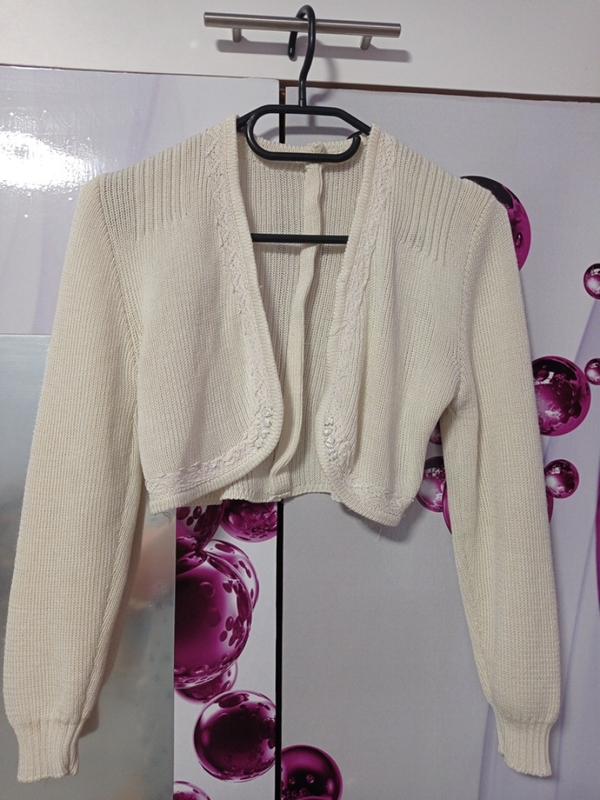 Короткая кофта, болеро без застежек, подойдет к платью, к чему угодно. Предварительно зауженная, при необходимости можно расшить. Длина изделия 36 см Длина рукава от шва 55 см Ширина ПОГ 40 см.
