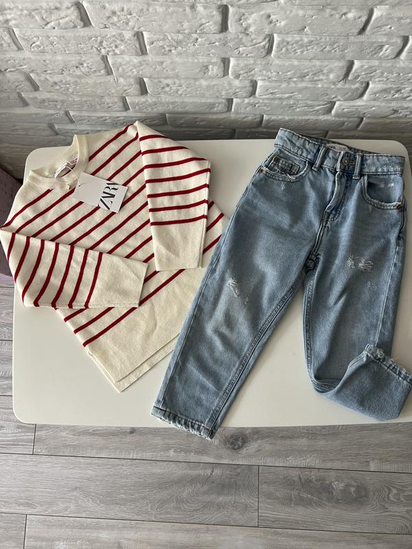 Кофта новая, очень мягкая и стильная Размер 110 см, можно и раньше Длина 43 см, рукав от шии 43.5 см, Грудь 36.5 см 580 грн джинсы Мом, размер 116, но будет от 110 см Состояние новых, надетые раза 2 480 грн