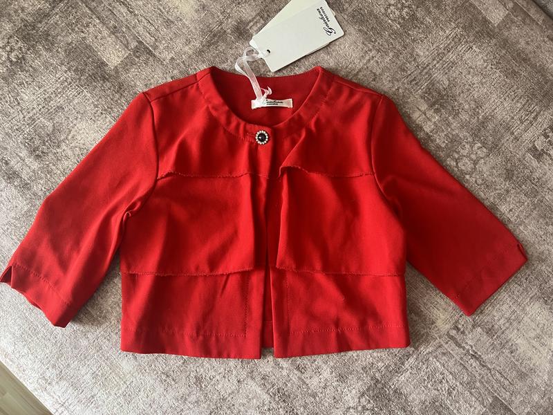 Болеро красного цвета. Ткань в виде костюмки. Ориентируйтесь по замерам: длина 32 см, ширина 33 см, рукав от плеча (укороченный) 26 см