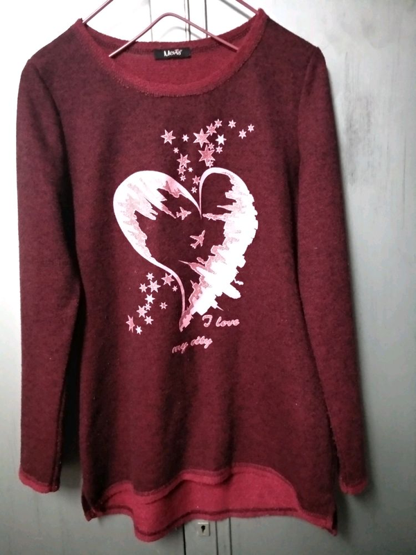 Тип одягу: Світшоти Туника девочке подростку на рост 164см. Приятный трикотаж, мягкий, изнанка как махрушка. Цвет меланжевый бордо с чёрным. Спинка длиннее переда, перед укорочен, по бокам небольшие разрезы. Впереди красивый узор. Состав: 67% хлопок, 33% полиэстр. Состояние отличное, было одето пару раз, но коротковато стало на девочку. Без изьянов. Мерки: под проймой 1\2- 43см. по талии- 39см. по бёдрам- 44см. Длина по центру спинки- - 68см. длина рукава- 56см. плечо- 8см. Перешлю любой почтой.