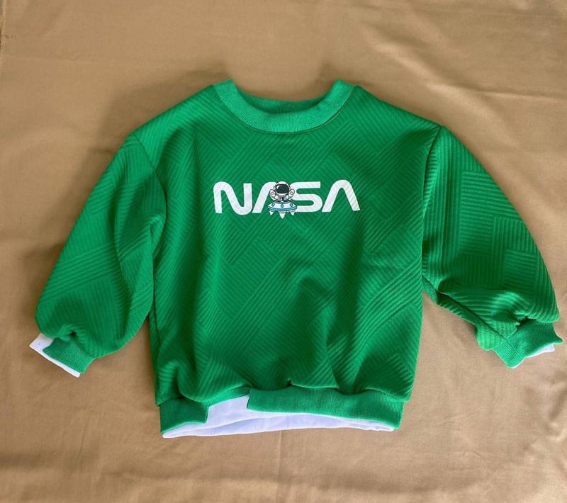Спортивный свитер для мальчиков NASA Размеры и цвета: Серый 130 (довж-51см; об/г-46см; ширина плеч-48см) 140 (довж- 54см; об/г-48см; ширина плеч-51см) Зеленый 110 (длиж- 45см; об/г-42см; ширина плеч-44см) 120 (довж-48см; об/г-44см; ширина плеч-46см)