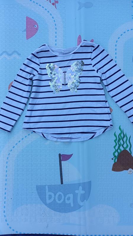 Кофточка дитяча для дівчинки ●Розмір 98 ●Тканина Лайкра, трішки тянеться ●Колір: білий в смужку Метелик паєтки, гарно сяють на сонці Кофтинка з довгим рукавом, ззаду довша ●Ціна 40 грн