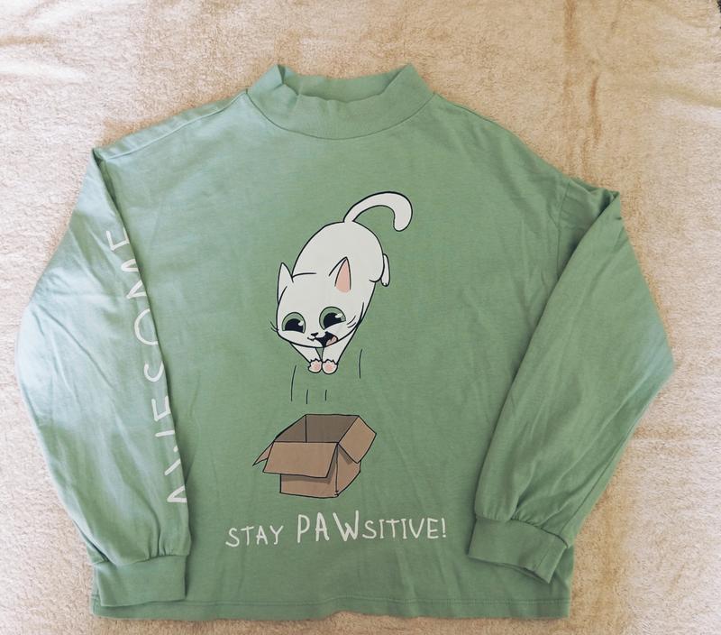 Реглан на девочку с котиком ментолового цвета. Состав 100% хлопок. Стан нового. Размер 128 см.