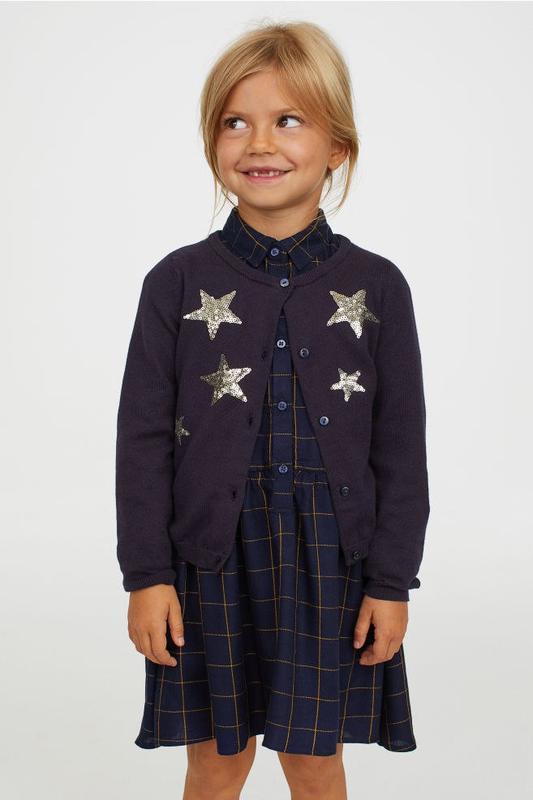 Кардиган из мягкого хлопка тонкой вязки с вышивкой блестками и пуговицами спереди. Резинка вокруг горловины, манжетов и подола. 100% котон.