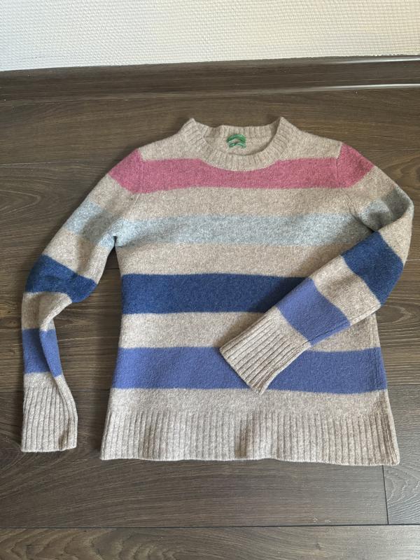 Кофта Benetton, размер XS, цвет бежевый в полоску, очень теплый, ткань плотная (трехе села на размер была s), стала замалая, подойдет на стройную девушку. В составе шерсть и кашемир, бирки срезанная, кашлатиться не будет, замеры на фото.