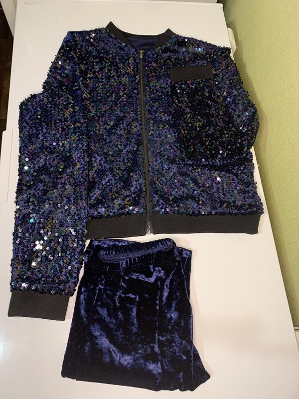 Темно-синього кольору, стан відмінний Довжина від плеча-49 см Ширина під рукавами-48 см Плечі-40,5 см Рукав-58 см Лосини велюрові