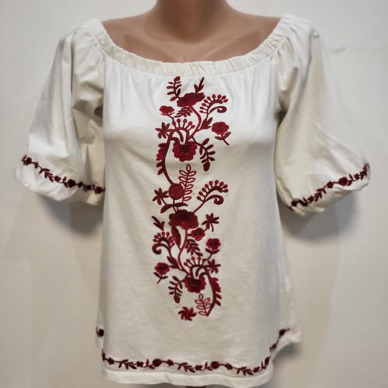 Кофточка с темно-красной вышивкой. Перед и спинка трикотаж футболочный, рукавчики верх коттон. Есть нюанс на пометном фото по середине сеж вышивкой дырочка. Замеры: ПОГ-45см, ПОБ- 53см, плечи на резинке-49см, бицепс- 38см низ футболочный, биципс верх рукавчика котон-44см, длина рукава-31см, длина изделия перед-51см