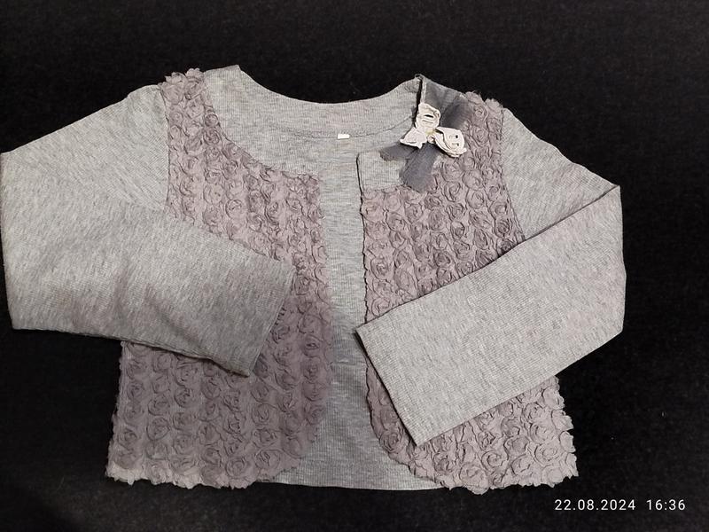 Минимальный заказ у продавца на 100 грн. Классное трикотажное болеро серого цвета в очень хорошем состоянии, нет несколько стразиков. Длина изделия по спинке от плеча 34 см, полуобхват груди 32 см, длина рукава 41 см. Ткань тянется. Модель 4569Т