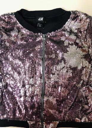 Кофта на замке с яркими пайетками, блестящая, стильная. Из пайеток выложен узор - цветы. Все пайетки хорошо прошиты, замок хорошо работает. Кофта не теплая, материал - 100% полиэстер. Размер на 8-10 лет, на рост 140см, замеры на фото. Стан идеален, никаких дефектов.