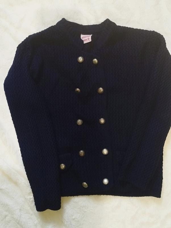 Прекрасный выбор для школы!!! Красивый, практичный кардиганчик прямого кроя. Классно гармонию с юбкой, брюками, фактурная вязка. Застежка в виде планки с пуговицами, имитированные карманы, украшены пуговицами. Стан - б/в, хороший, без нюансов. Замеры: Длина - 50 -51 см Длина рукава - 45-46 см ПОГ - 41-42 см