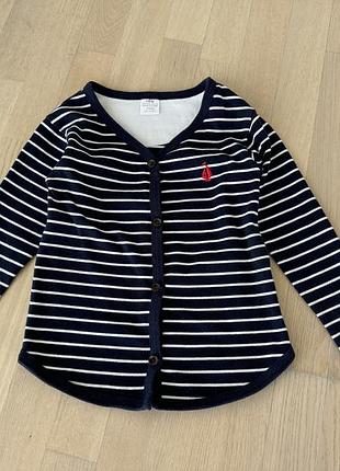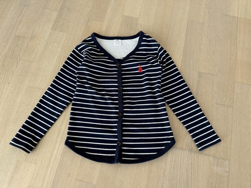 Кофта в идеальном состоянии. Никаких нюансов. Тонкий хлопковый трикотаж. Очень приятный к телу. Застегивается на пуговицы. Цвет темно-синий в белую полоску. Идеально на теплую осень/весну, или же прохладными летними вечерами поверх маечки/футболочки/сукни. Замеры есть на фото Смотрите другие Мои объемы. Экономьте на доставке. У нас двое детей. Продаю собственно б/у (купалось в магазинах/замазывалось на официальных сайтах) только в отличном состоянии. Или же пролеты с размерами. Постоянно действует акция на вещи б/у: заказываете 2 вещи, третью (менее по стоимости) получаете в подарок. Не все вещи выставлены. Не успеваю физически. Поэтому запрашивайте. Есть вещи на девочку до роста 146 и на парня до роста 158