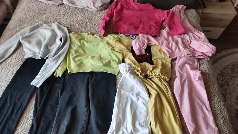 Вещи пакетом для девочки где-то на 9-10 лет,розовый и желтый костюм будут дольше,все вещи теплые кроме желтого и розового костюма.Стан хорош.В комплекте идет 2 костюма,3 шт кофты,2шт брюк-трикотаж на тонком флисе,1шт джинсы на флисе.За все 1300 грн