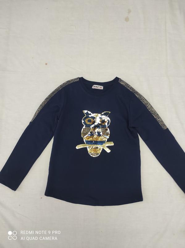 Синяя кофта для девочки украшена рисунком "Сова", выставленным из золотистых пайеток, на рукавах рисунок, вышитый золотистой нитью. Красиво смотрится с брюками, джинсами ПОГ 37 Длина изделия 44 Длина рукава 46