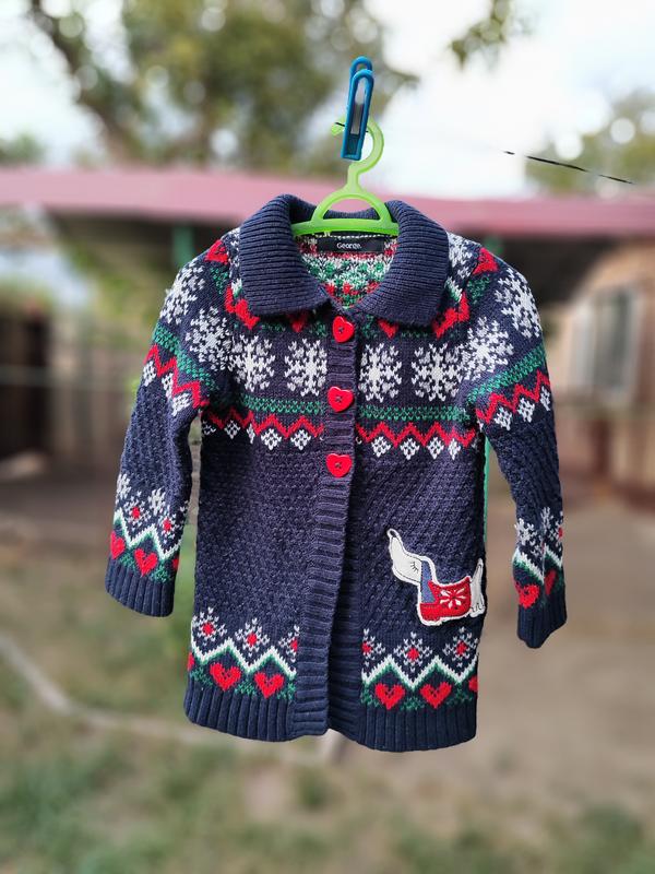 Теплая кофта для девочки Состояние: идеальное Возраст: 1,5-2 года Рост: 86/92 Фирма: George Материал: 98% акрил, 1% полиэстер, 1% фибра Замеры: Длина: 44 см Ширина по груди: 31 см Длина рукава от шеи: 34 см