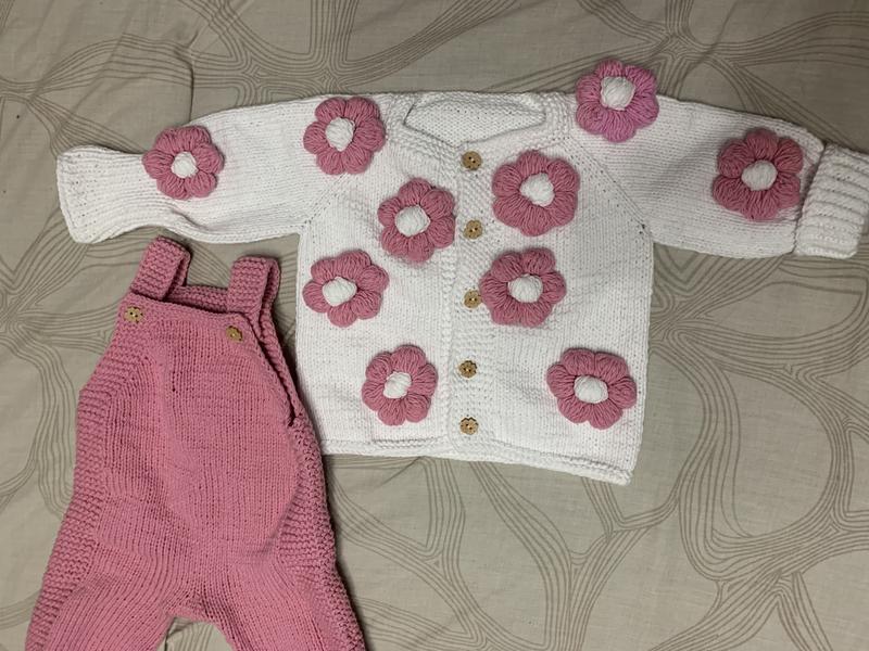 Ручна вʼязка. Новий набір (подарували не по віку). Дуже приємний до тіла, мʼякий, гарно тягнеться при потребі. Теплий. Бірки не було, тому складно оцінити розмір, заміри на фото. Можливо на рік +/- 80