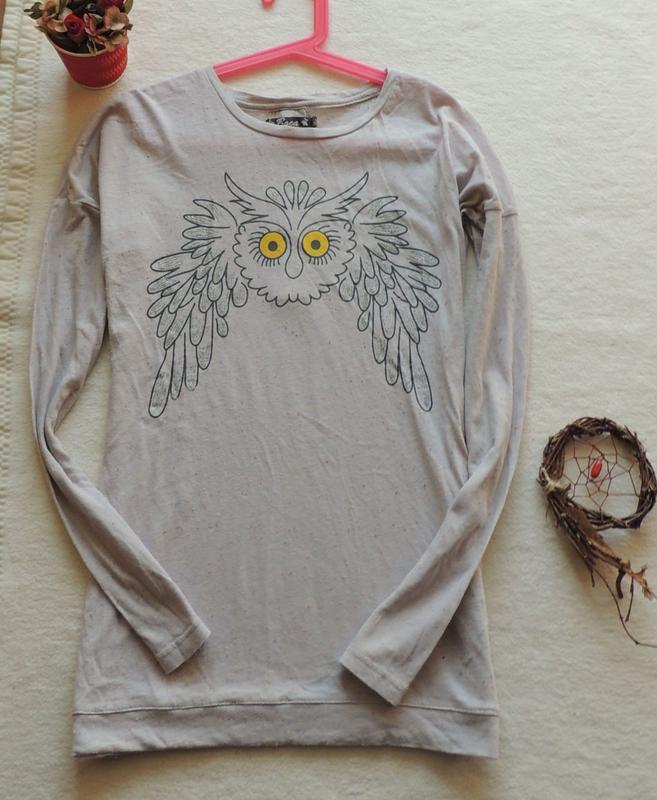 реглан с совушками бренд бока 158-164 по этикетке модель удлиненная красиво будет смотреться с леггинсами под мышкой 50 рукав весь от горловины 67 от подмышки 45 длина по спинке вдвоёт 58