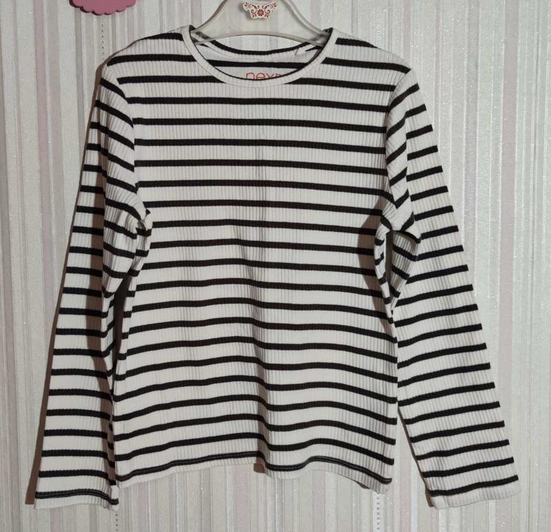 Реглан в полоску от Next в размере 6-7 лет. Состояние нормальное. 95% хлопок, 5% эластан. Замеры: длина 43, ширина 32, рукав 43. При покупке трех товаров – укрпочта в подарок!