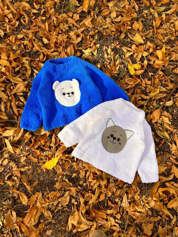 Новые свитерики для деток. Не успели совсем поносить,пролет в размерах (( Полностью ручная работа. Очень мягкие на ощупь с милыми мордашками животных. На рост 80-86 см. При необходимости пришлю замеры. Цена указана за 1 свитерик