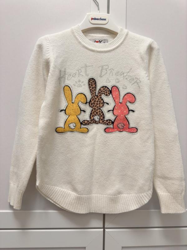 Которая трикотажная кофтинка очень приятная на ощупь. Одягнена Один раз. Стан идеален. Цвет Слоновой кости ближе белого. На бирке указано 10 лет. Но ориентируетесь по замерам: длина рукава 47, плечо 7, длина от шейной точки плеча 52, Бик короче, полуобхват груди 37. Изобретенная в Италии, выглядит очень достойно, украшена камушками и притом плюшевое с зайчиками.