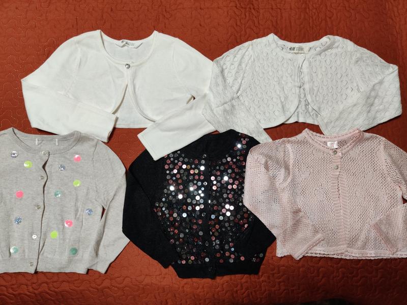 В идеальном состоянии, некоторые даже не одеты. Все H&M кроме розовой. Это идеальный вариант на платье, праздничные наряды и т.д. Верхняя белая гладкая 4-6р, длина 23см, рукав 42см от плеча. Верхняя белая узором 2-4р, Длина 22см, рукав 39см Бежевая в цветные кружочки 4-6р, длина 33см, рукав 33см Темно серая в пайетках, длина 33см, рукав 35см Розовая очень нарядная, длина 30см, рукав 38см. Размер 5-6р Цена любой 150 грн