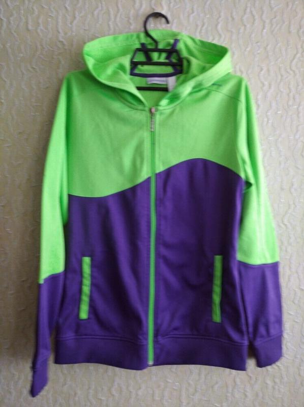 Яскрава спортивна кофта з маленьким флісом для дівчат підлітків чи худеньких жінок, р.32-34, Energetics . Колір - неоновий салатовий та фіолетовий. ПОГ 44 см. Довжина рукава з плечем 70 см. Довжина кофти по середині спинки 61 см.