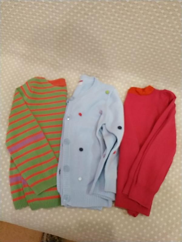 темно розовая с маленьким бантиком, зелено-оранжевые полоски, голубая кофточка с ризноцветными узелками,