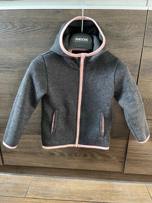 кофта H&M на девочку 3-4 года (98-104 см). Очень теплая и очень классная,с капюшоном. В середине флисовый утеплитель, изнаночные вязка, по канту розовая и розовые карманы. Длина по переду 38 см, сзади41 см, ширина 30 см,рукав 33 см, плечо 7 см
